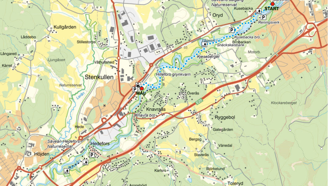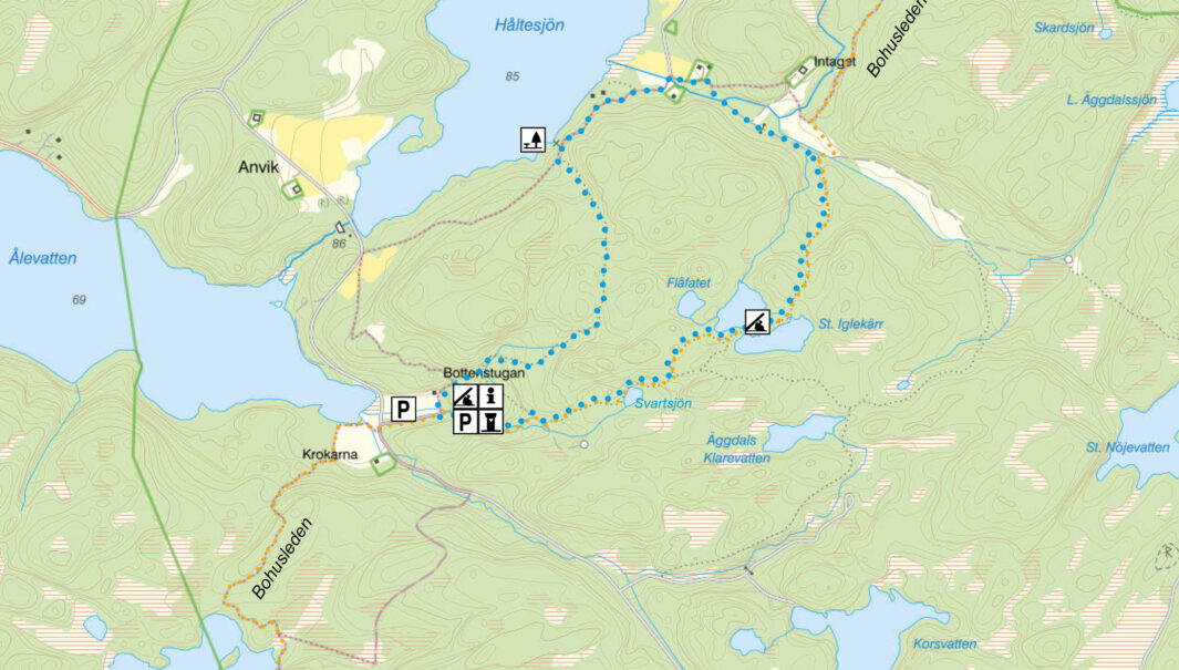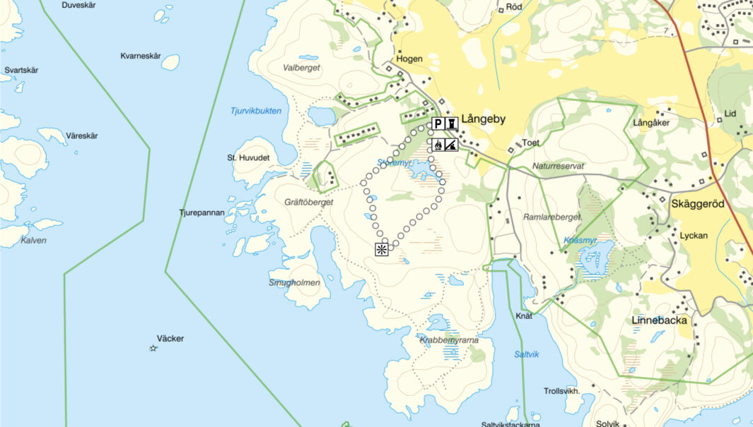 Längd: 2,3 km. Svårighetsgrad: medel, det är brant uppför vid utsiktspunkten. Start och mål: reservatsparkeringen. Vägbeskrivning: Från E6 kör av mot Grebbestad, och vidare mot Havstenssund. Sväng vänster, mot Saltviks camping cirka 4 km norrut, vid skylten ”Naturreservat”. Passera campingen. Parkeringsplatsen nås efter cirka 250m. Reservatet ligger i Tanums kommun. Vandringstipset som PDF
